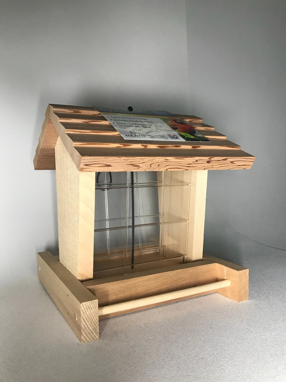 The Classic Plus Bird Feeder is a hopper-style feeder with a 3-pound capacity. Two full-length perches span either side, offering plenty of space for birds to feed together. Durable decay-resistant and weather-resistant cedar construction. Roof lifts up for easy refilling. Plastic panels remove for cleaning.